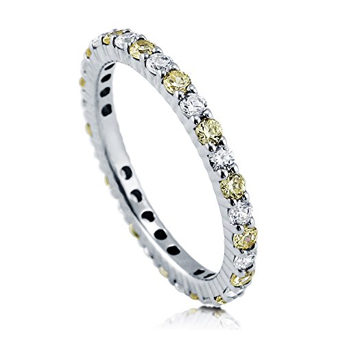 This eternity ring is made of rhodium plated fine 925 sterling silver. Set with 0.84 carat round cut canary yellow and round cut clear cubic zirconia in pave setting. Band measures 2mm in width. Imported. DISCLAIMER: All cubic zirconia stone weights are approximate and listed as diamond equivalent weight in carats. Actual product colors may vary from colors shown on your monitors due to variations in calibration. Jewelry is not intended for children under 13 years of age. Photos may be enlarged to show details.