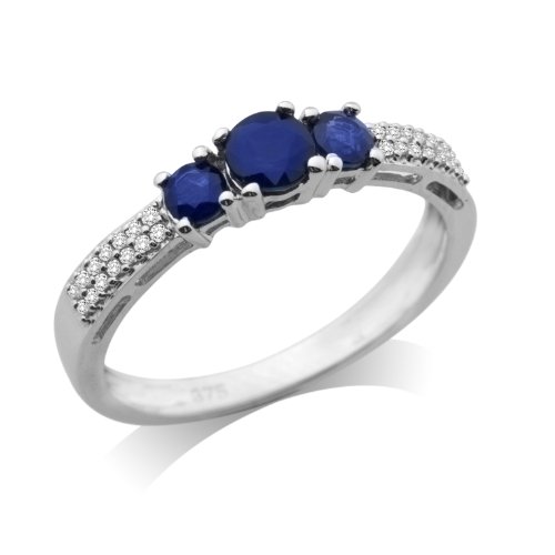 Ladies diamond and sapphire ring in 9ct white gold. Three blue sapphire stones enhanced with glittering diamond set shoulders in this classic 9ct gold ring making it a stunning gift she will cherish forever.