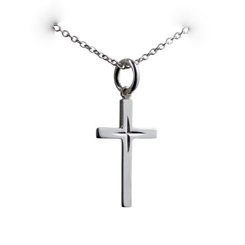 Sterling Silver 31x16mm diamond cut star Block Cross. Handmade from 2 mm by 2 mm square wire, the back and sides are also plain highly polished. Made and hand polished in our Birmingham factory and comes to you carefully prepared in a black leatherette gift box and is fitted with a rolo chain 22 inches long.